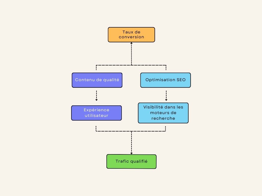 Ce schéma illustre comment un contenu de qualité et une expérience utilisateur positive, associés à une optimisation SEO efficace, peuvent contribuer à améliorer le taux de conversion. L’optimisation SEO permet d’accroitre la visibilité du site dans les moteurs de recherche, ce qui augmente le trafic qualifié. Un trafic de qualité, combiné à un contenu engageant et à une expérience utilisateur optimale, favorise une conversion plus élevée. Ainsi, le SEO agit comme un catalyseur pour attirer un trafic qualifié, tandis que le taux de conversion est influencé par la qualité du contenu et de l’expérience utilisateur.